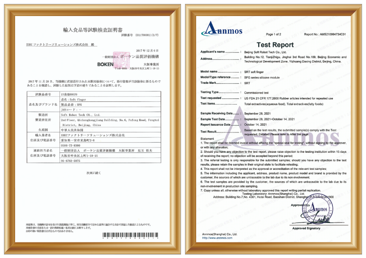 "2" certification - The gripper fingers are made of food-grade silicone, which has passed the US FDA testing and Japan's JFSL370 two-way testing certification.