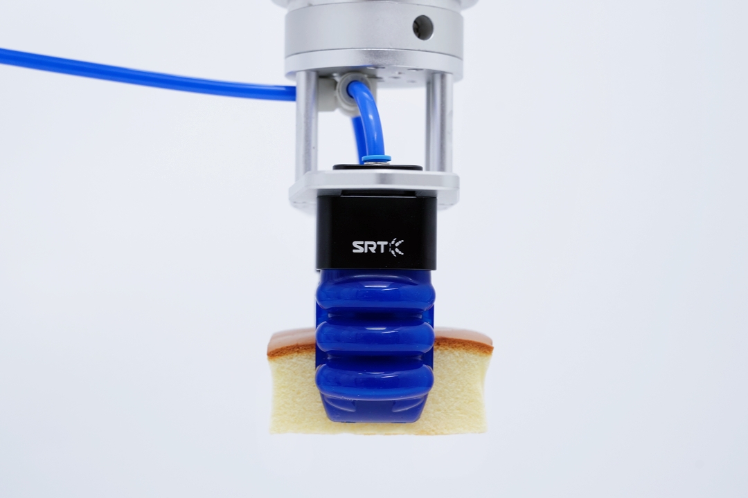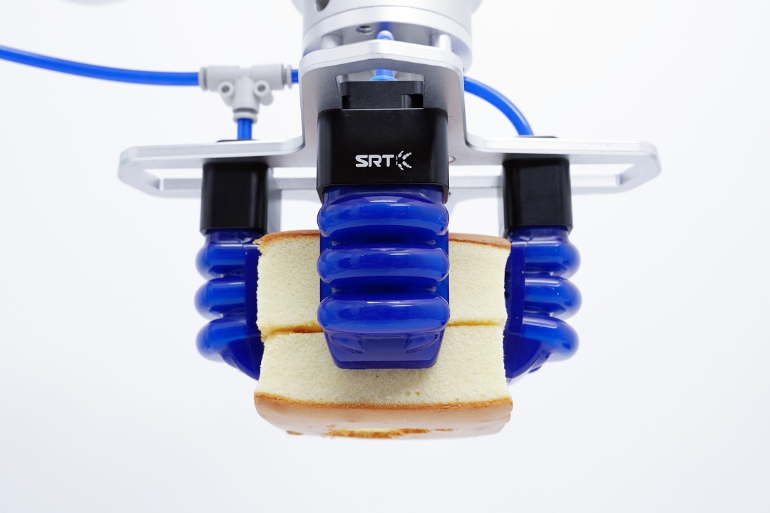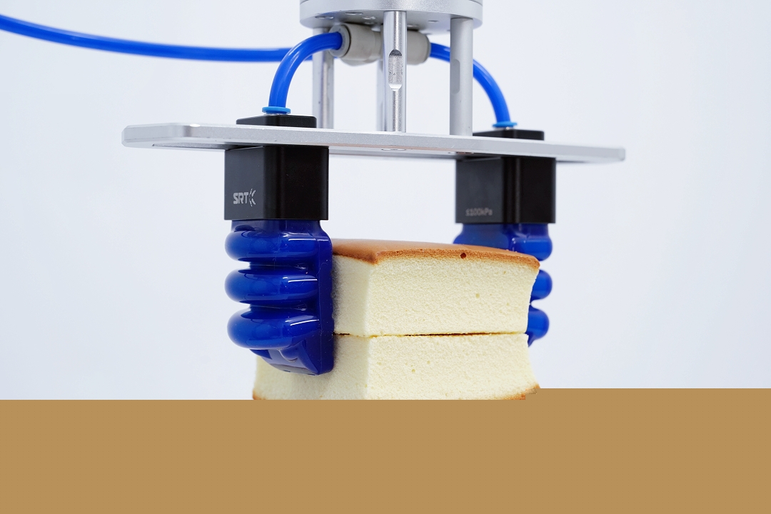A baking company specializing in large-scale production of cakes had a core requirement to automate the process of picking up double-layered cakes from the production line. These cakes have physical characteristics such as being soft and prone to damage from squeezing, and having a browned crust that is easily scratched. Additionally, the production process must meet food-grade hygiene standards, operate at high speed and continuously, and have low waste. These requirements put traditional automation solutions in a dilemma - manual picking is inefficient and poses hygiene risks, while conventional rigid grippers and vacuum suction cups frequently cause product damage and surface contamination, becoming a key bottleneck for capacity expansion. Based on bionic principles and soft robot technology, SRT's flexible end effector provided a targeted technical solution that enabled the client to achieve "damage-free, efficient, and compliant" automation upgrades.