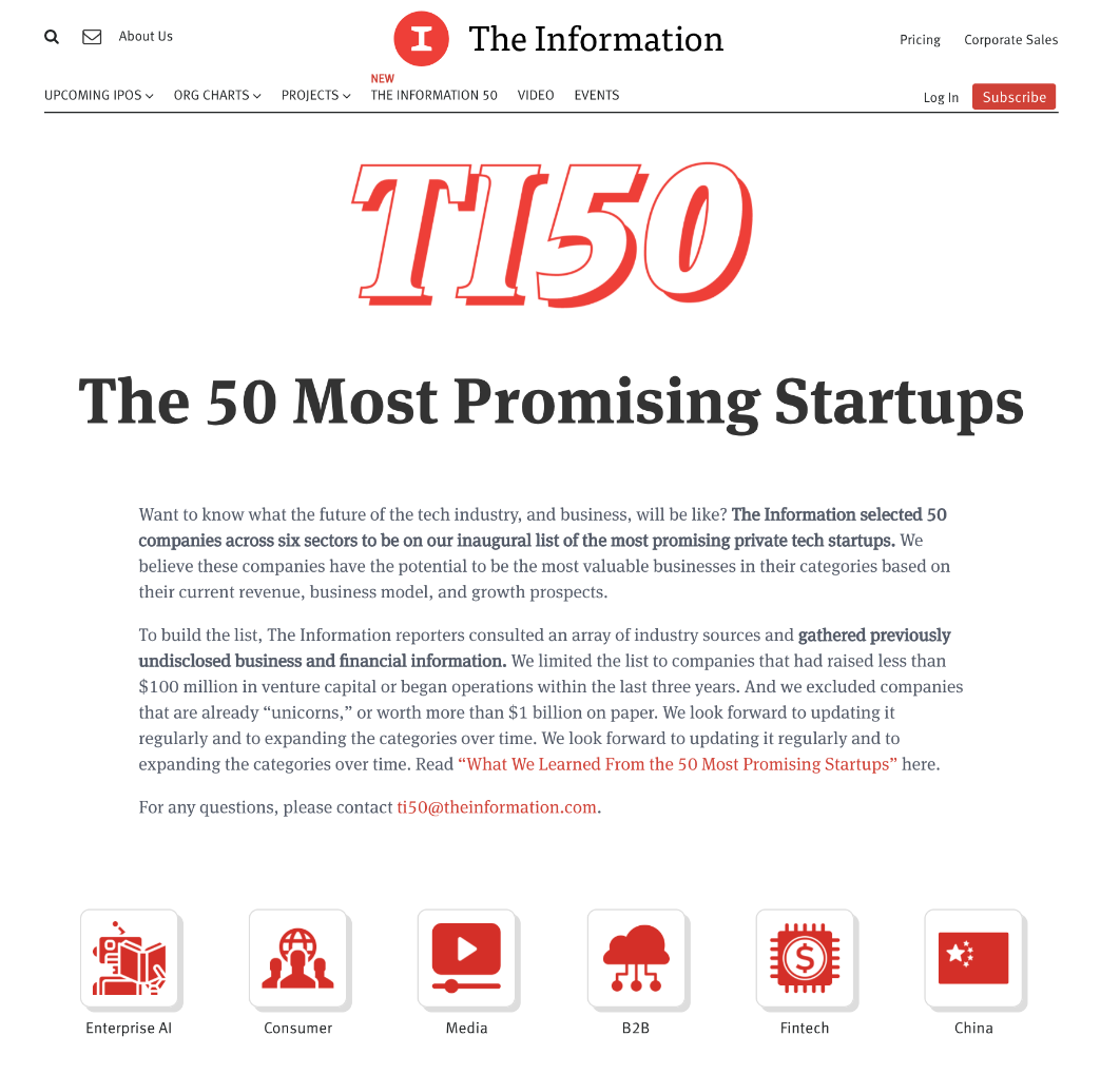 The Information是硅谷最有影響力的科技媒體之一。在全球84個國家和地區(qū)擁有數(shù)萬名付費訂閱用戶。“全球最具發(fā)展?jié)摿Φ?0家初創(chuàng)企業(yè)”榜單是The Information的年底“招牌菜”,也是全球最有影響力的初創(chuàng)企業(yè)風向標之一。今年這份榜單從商業(yè)模式、競爭力和經(jīng)營表現(xiàn)等方面評估企業(yè)前景,入圍企業(yè)被認為是“最有前途的科技創(chuàng)業(yè)公司”。