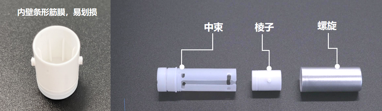 國內(nèi)某知名化妝品公司,在產(chǎn)品制造中需將口紅棱子精準放入螺旋槽內(nèi)進行組裝。棱子直徑9mm,深度12mm,是口紅管的核心組件,承載著整個口紅管產(chǎn)品的扭力、順暢度。其內(nèi)壁帶有條形筋膜,以塑料為基材,在生產(chǎn)過程中易出現(xiàn)破損、劃痕現(xiàn)象。