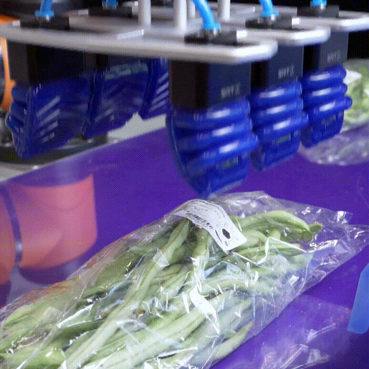 大多長(zhǎng)條形蔬菜在進(jìn)行包裝時(shí),都會(huì)自帶種種小傲嬌,例如永遠(yuǎn)達(dá)不成一致的身高、過于松散的體態(tài)結(jié)構(gòu)、忽胖忽瘦的重量體積等。這類蔬菜在經(jīng)過自動(dòng)蔬菜包裝機(jī)后,相較于以往的人工揀裝盒/箱的方式,由SFG柔性?shī)A爪替代人工,將各類條形蔬菜包通過智能抓取,分揀至箱盒內(nèi)整齊劃一的位置擺放,更能大大提高運(yùn)營(yíng)效率。