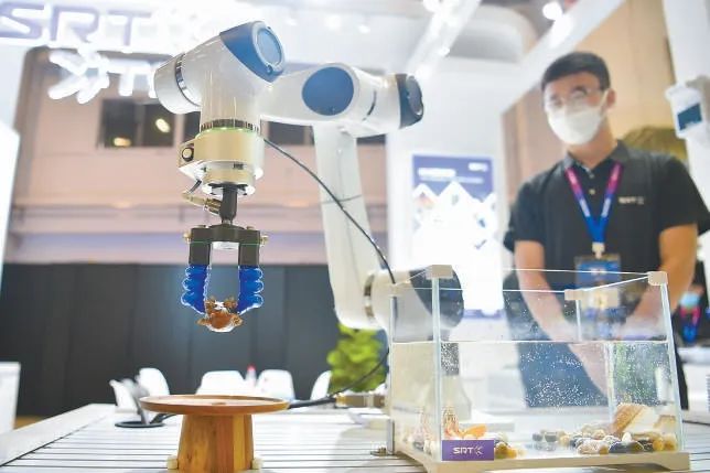 在HICOOL2022全球創(chuàng)業(yè)者峰會展覽展示區(qū),軟體機器人展示水中抓“海參”等技能。 機械臂緩緩下降浸入水中,兩根“手指”張開,一根柔軟的海參被輕松抓取,完好無損地放入一旁的托盤內(nèi)。在HICOOL會客廳展區(qū),正在進行抓取展示的軟體機器人吸引不少人駐足觀看?!斑@次帶來的5臺設備都是我們的明星產(chǎn)品,可以應用于食品生鮮、醫(yī)療器械等多個領(lǐng)域?!避涹w機器人科技有限公司工程師劉德才介紹。除了能在水中抓取物品的軟體機器人,源自對壁虎腳掌仿生學研究的另一臺設備,則能輕松抓取電路板和玻璃面板,不造成絲毫磨損。