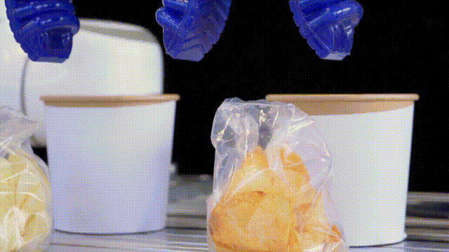 不同于傳統(tǒng)夾爪的剛性結(jié)構(gòu),SRT柔性夾爪擁有“高效”、“無損”、“安全”三大特點,尤其適用于抓取餅干、糕點這類薄脆、松軟易變形的食品。