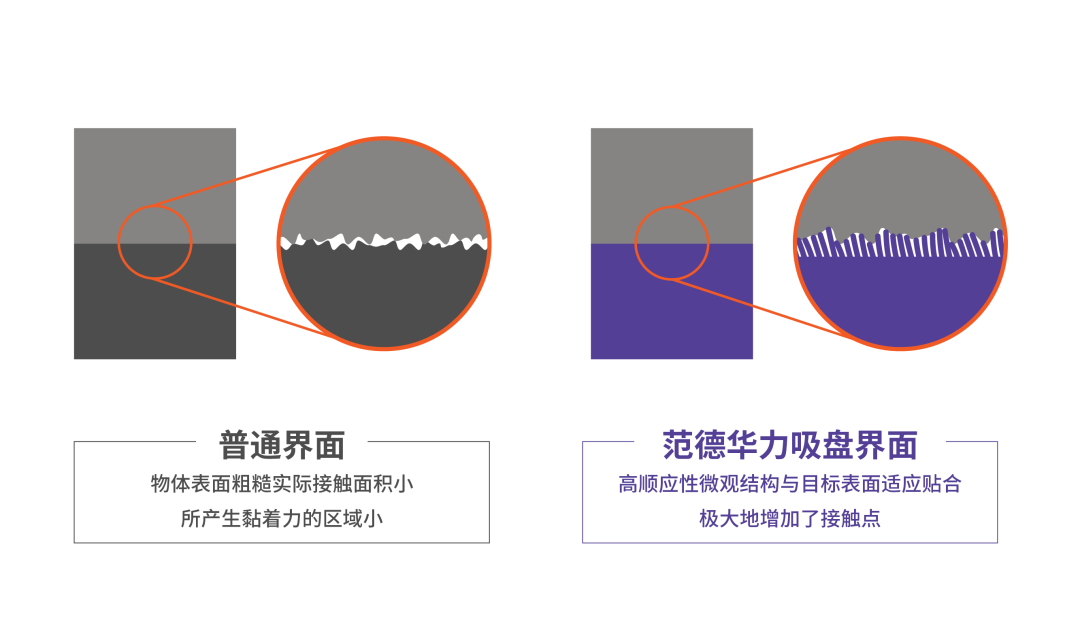 【范德華力】通過(guò)特殊的聚合物材料和微納成型工藝,增大吸盤與物體接觸面積,從而產(chǎn)生強(qiáng)烈的分子間作用力,即范德華力。